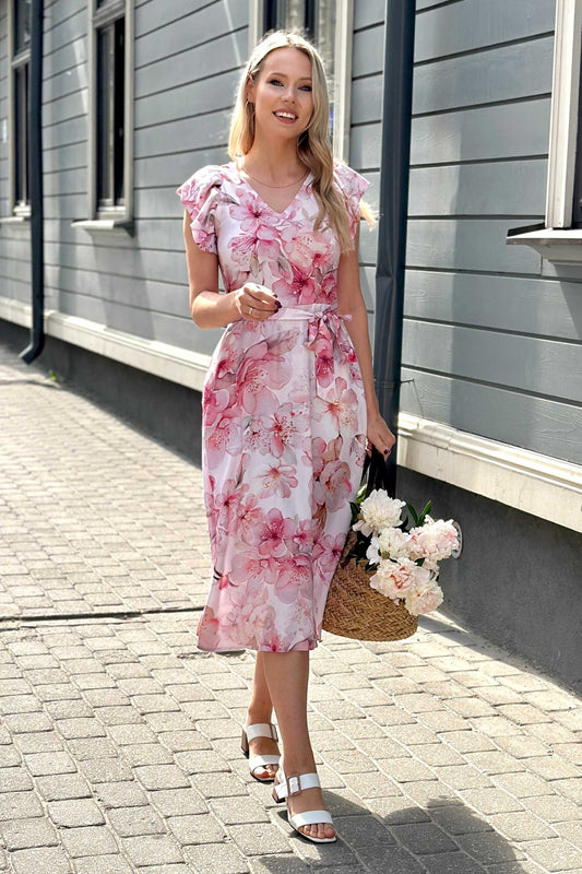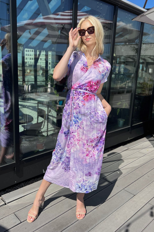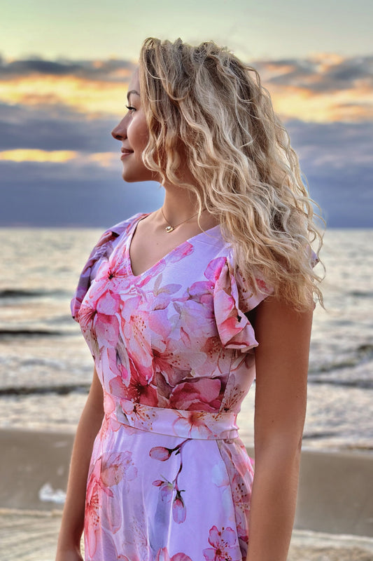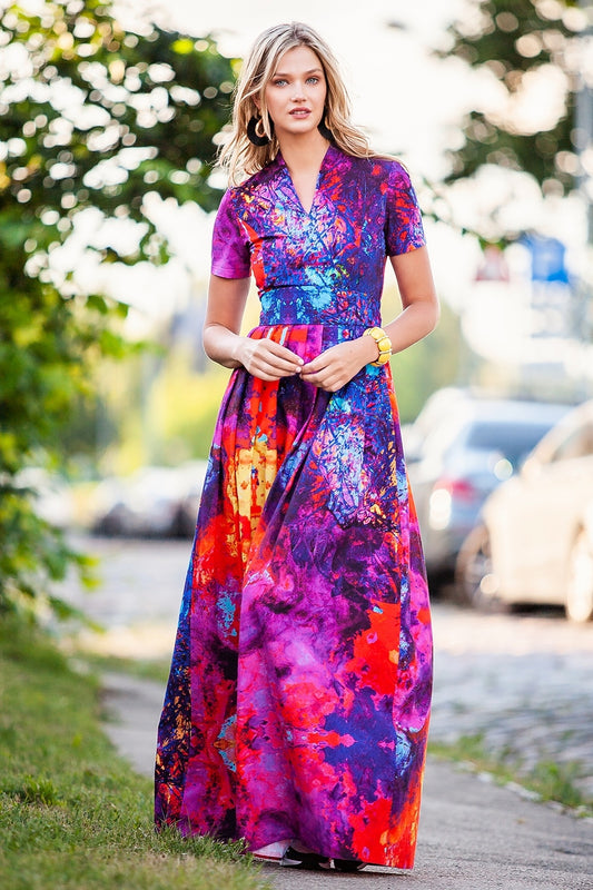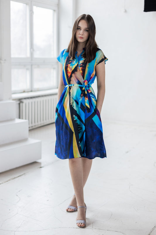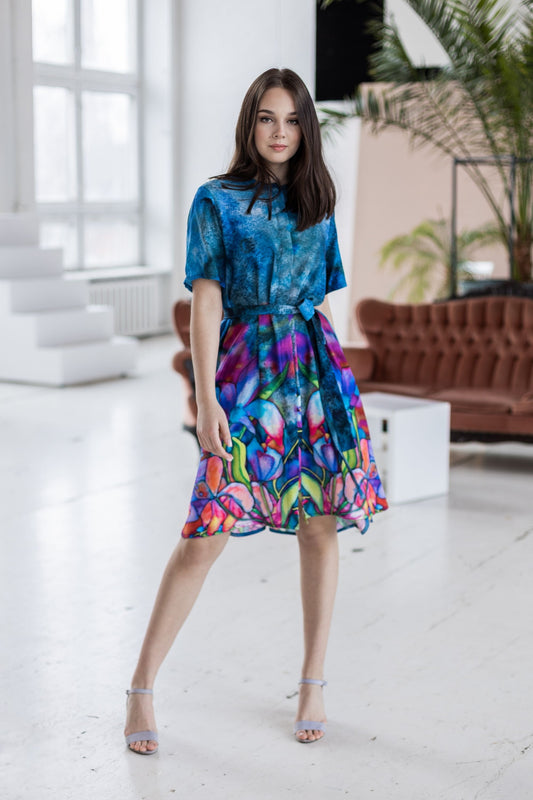 Kurzes und weites Sommerkleid mit leuchtendem Blumenprint