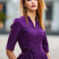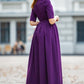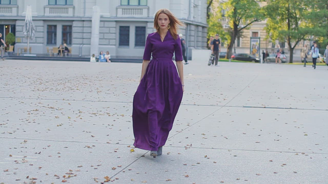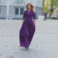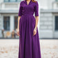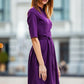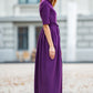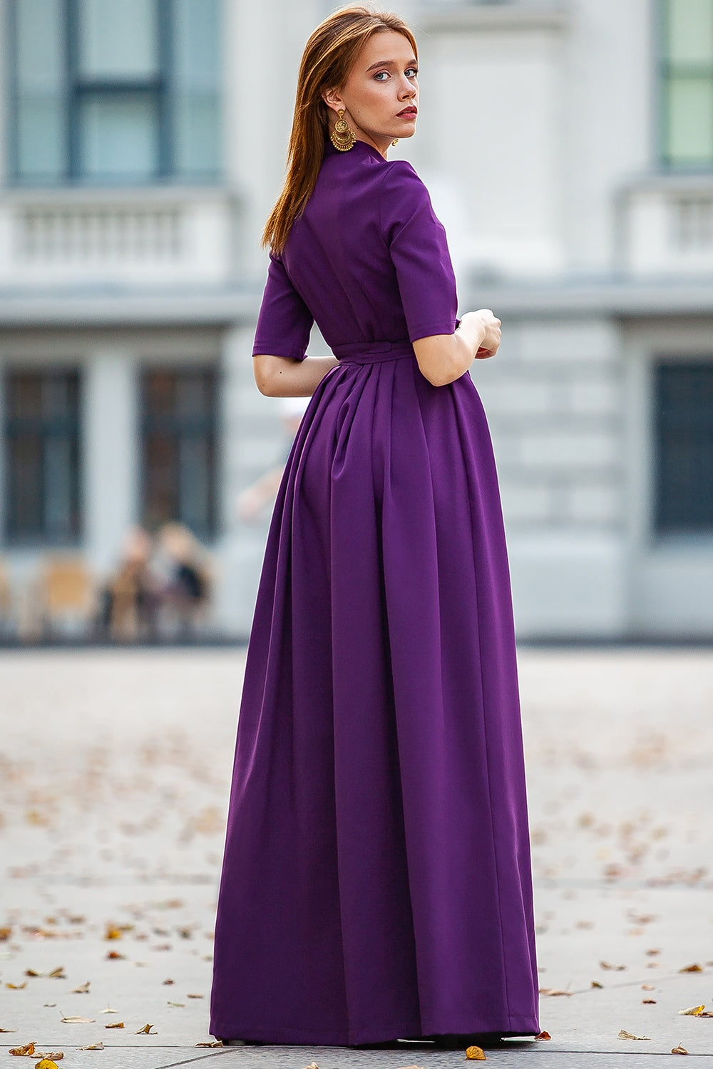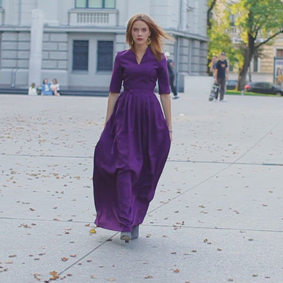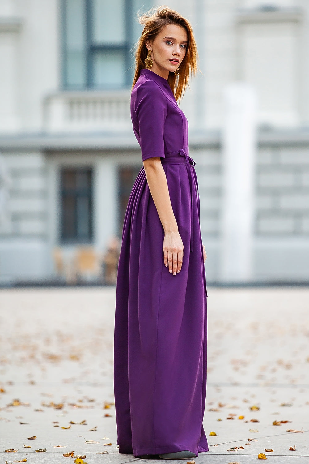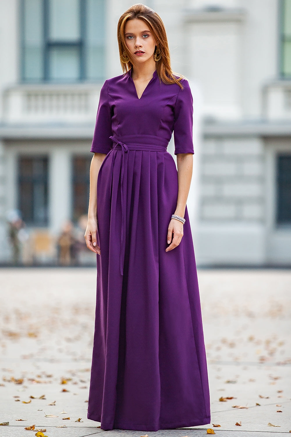 Klassisches Maxikleid in Dunkellila mit Falten und abgetrenntem Gürtel. Kleid mit mittellangen Ärmeln und V-Ausschnitt.