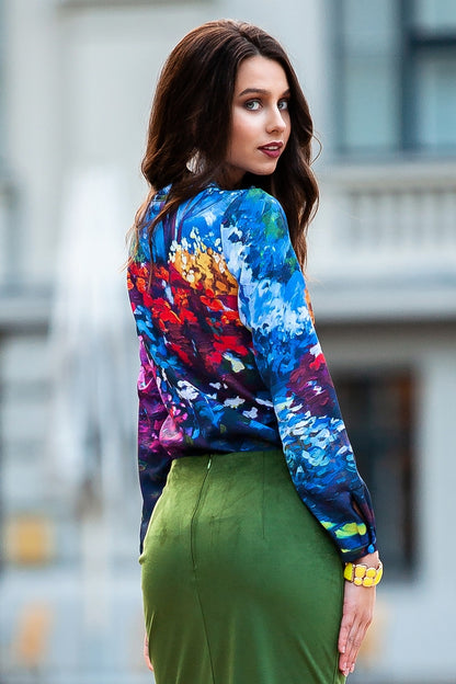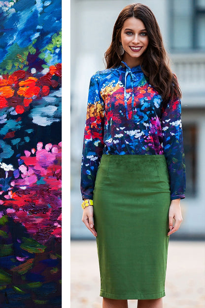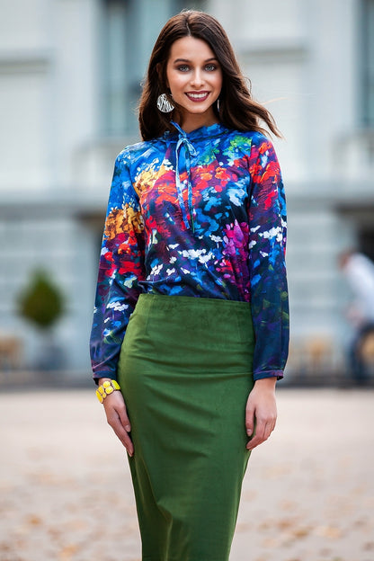 Bluse mit zart leuchtendem Blumendruck und mit Schleife vorne, lange Ärmel.