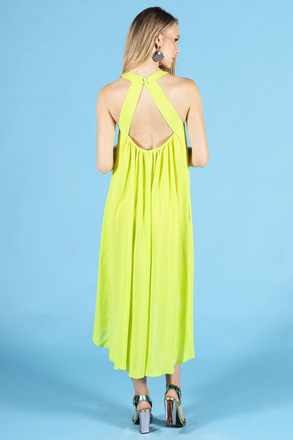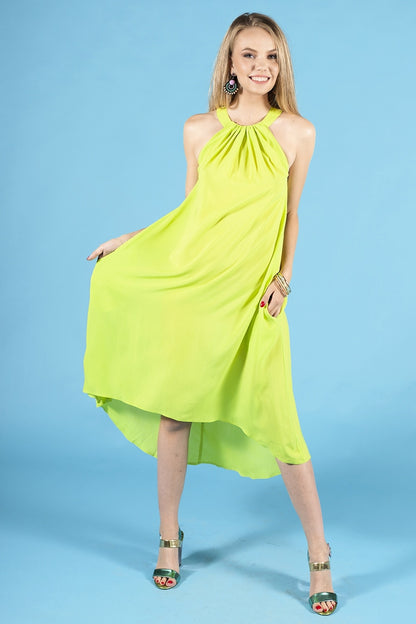 Hellgrünes Kleid mit Seitentaschen. Ärmelloses Kleid, niedrigerer vorderer Saum, höherer hinterer Saum. Rückenlinie ausschneiden, Rücken zuknöpfen.