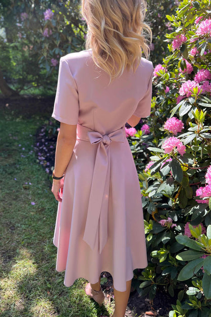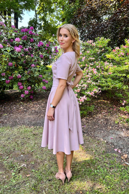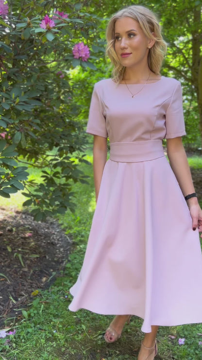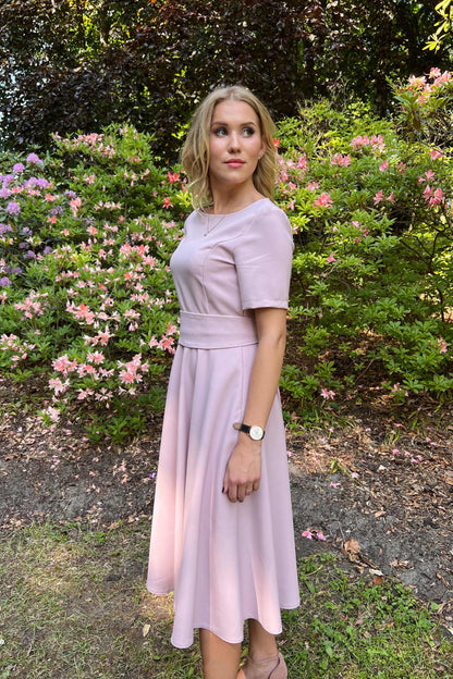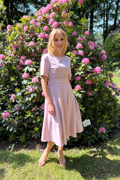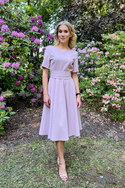 Lilafarbenes Kleid mit Tellerröcken, kurzen Ärmeln, seitlichem Reißverschluss und Futter im Rockteil. Mit getrenntem Gürtel. Der Stoff ist angenehm zu tragen, wenig elastisch und knittert nicht. Nach dem Waschen bleibt die Farbe gleich leuchtend.