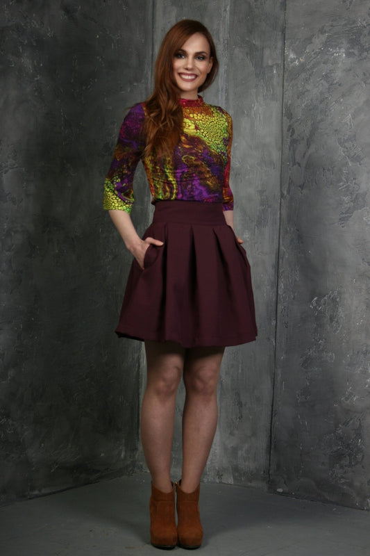 Kupli mini svārki vīnogu tonī ar sānu kabatām