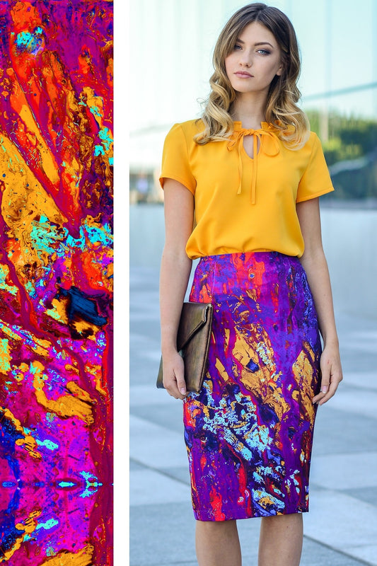 Zīmuļ svārki ar dzelteni violetu apdruku