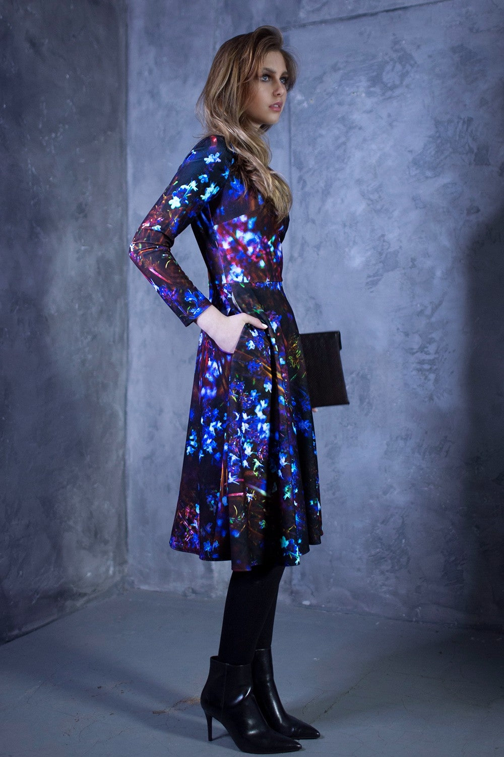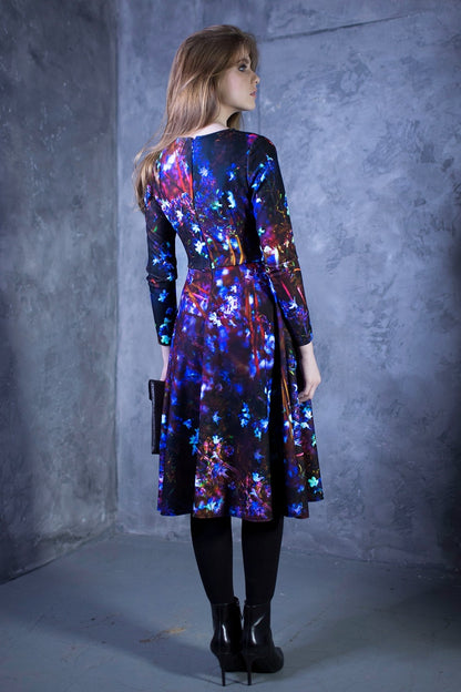 Tumša kupla kleita ar ziliem ziediem. Kleita ar pusgarām piedurknēm, noapaļotu kakla izgriezumu un sānu kabatām.