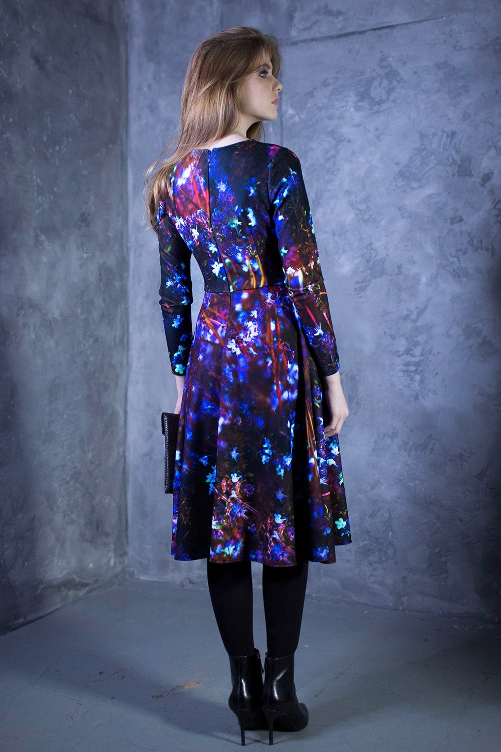 Tumša kupla kleita ar ziliem ziediem