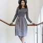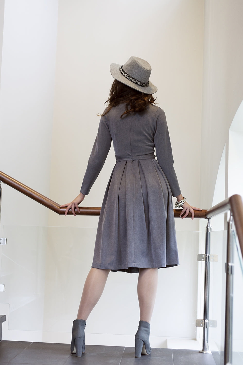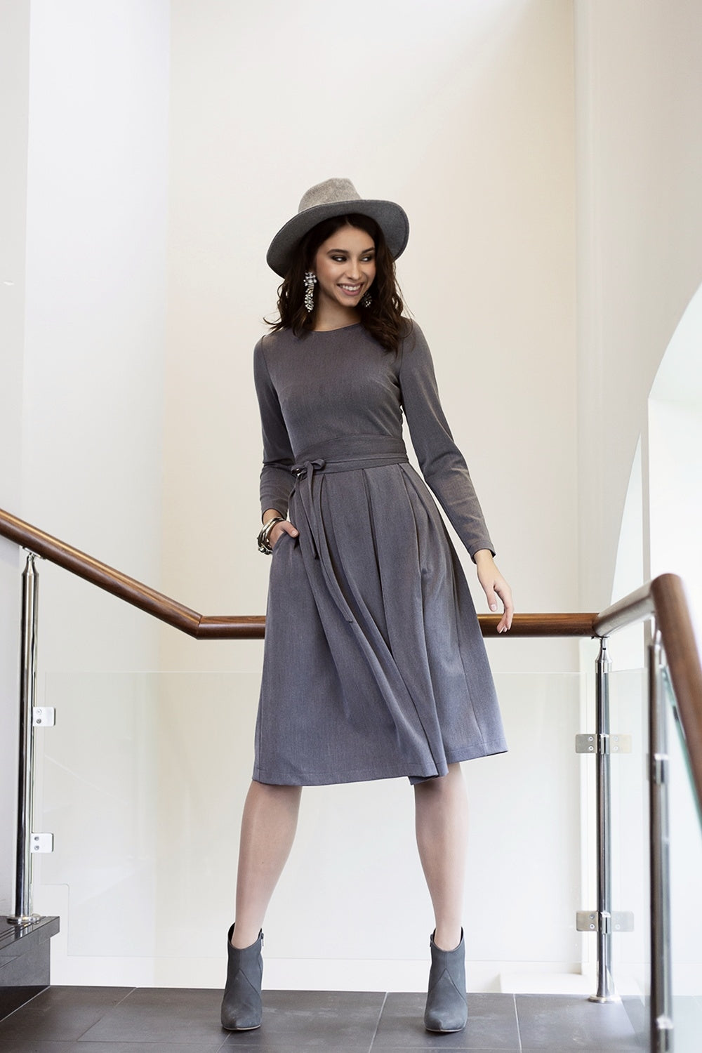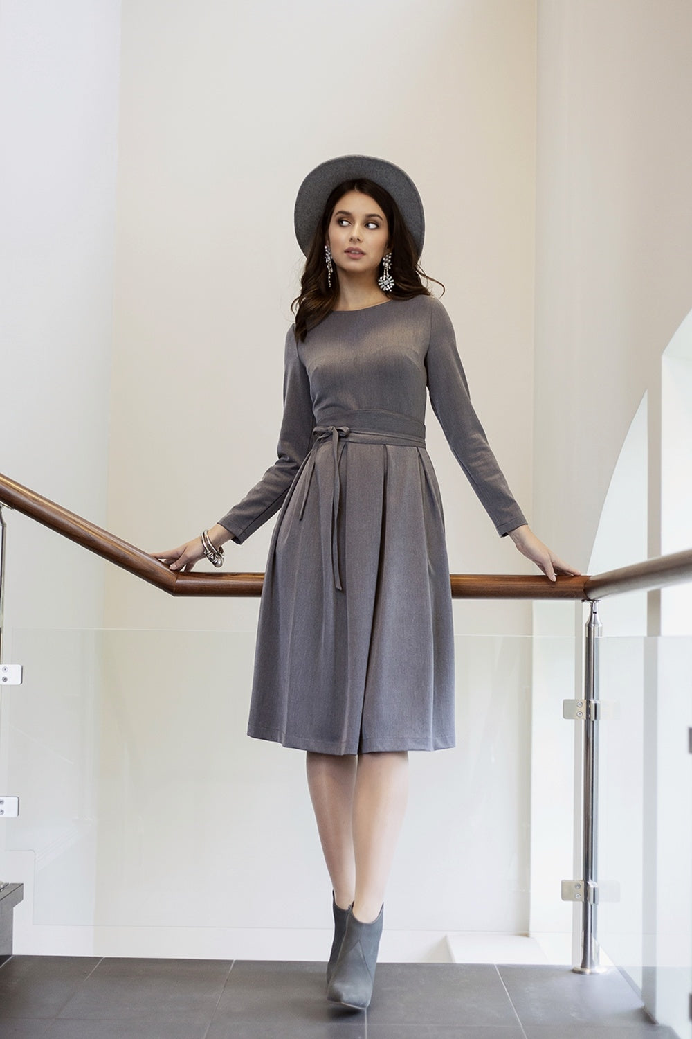 Pelēka kleita ar sānu kabatām un noapaļots kakla izgriezums. Kleita ar garām piedurknēm, atsevišķu jostiņu, ielocēm svārku daļā un rāvējslēdzēju mugurpusē..