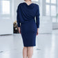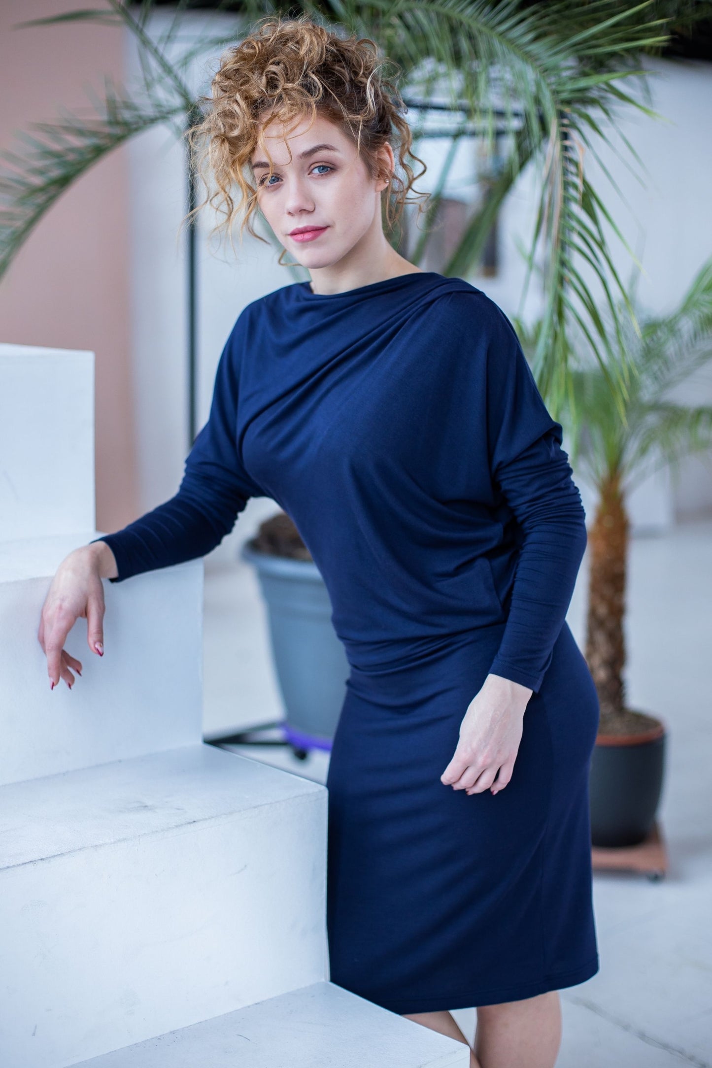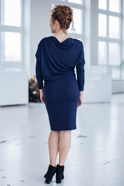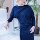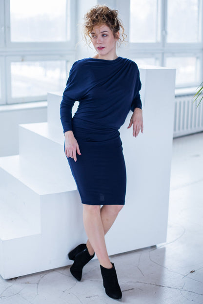 Tumši zila asimetriska kleita ar sasienamām aukliņām