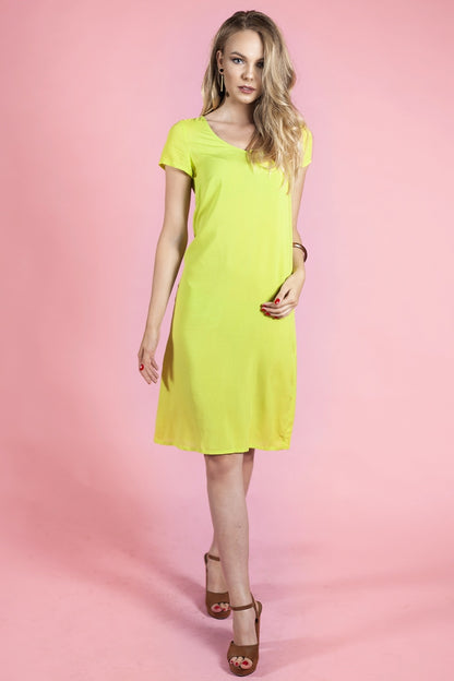 Gaiši zaļa brīva piegriezuma kleita. Kleita ar īsām piedurknēm un v-veida kakla izgriezumu.