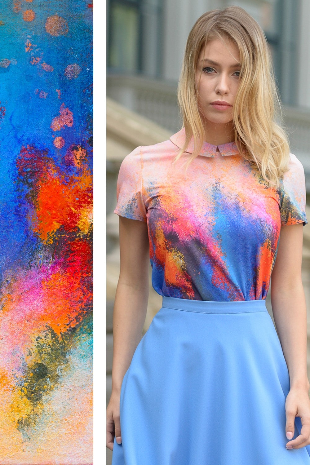 Blūze ar abstraktu apdruku. Blūze ar apkakli un pogu aizmugurē.