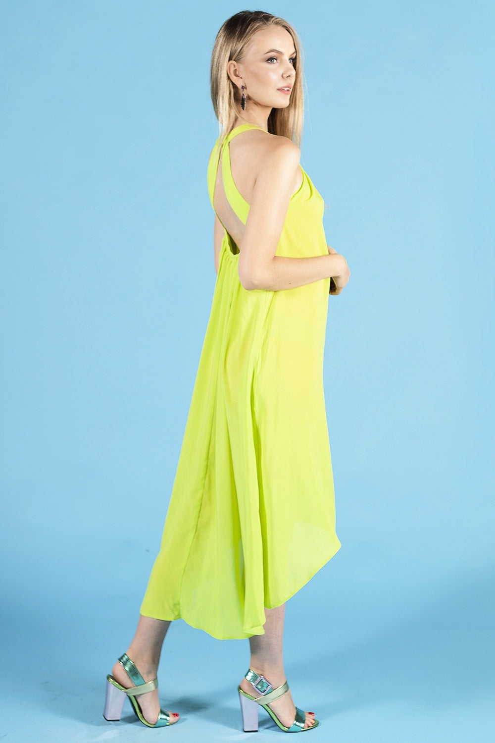 Kleita bez piedurknēm, īsāka apakšmala priekšpusē, garāka muguras apakšmala. Izgriezts kakla izgriezums, poga aizmugurē.