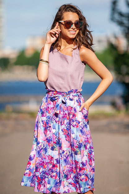 Krēmkrāsas lina tops ar asimetrisku kakla izgriezumu.