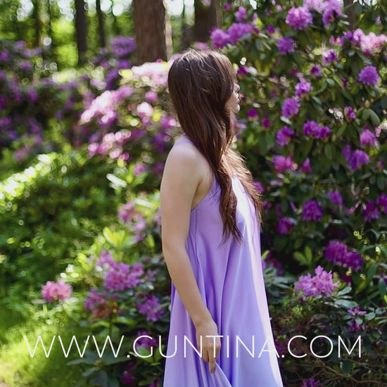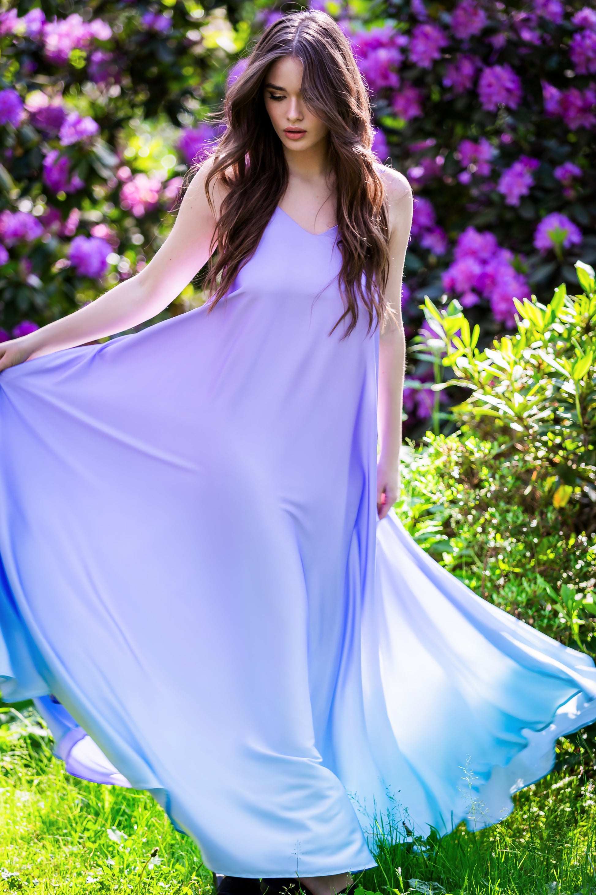 Eleganta maksi kleita ar izgriezumu uz muguras, ar krāsu pāreju no ceriņkrāsas līdz debeszilai