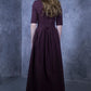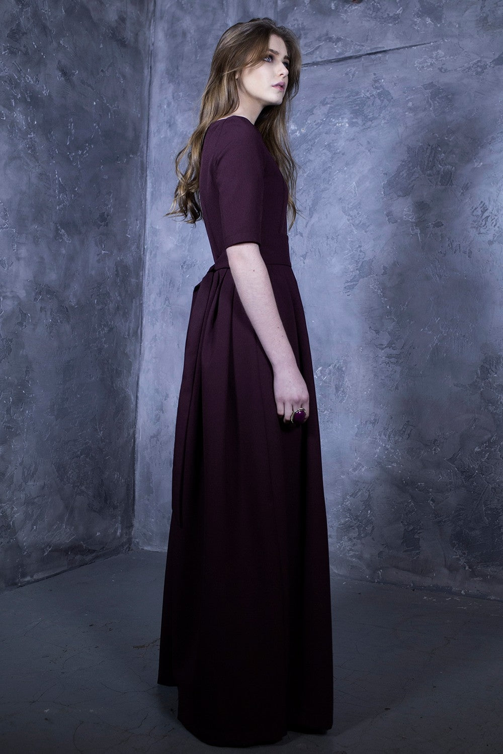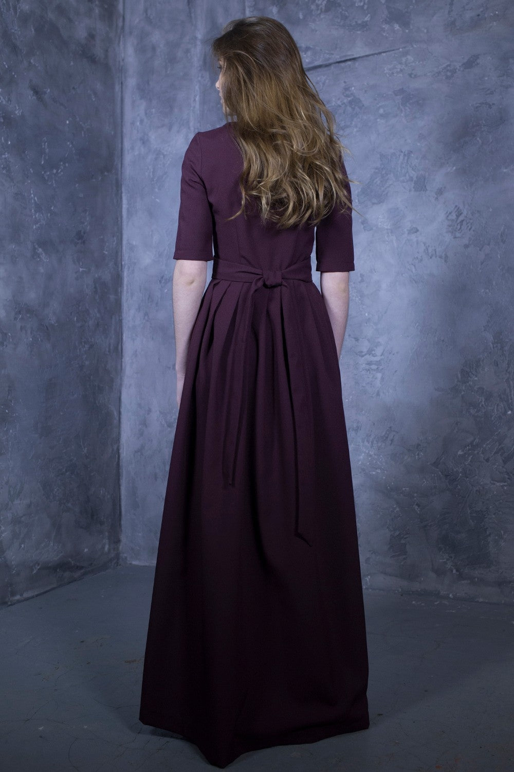 Maxi kleita vīnogu krāsā ar ielocēm. Kleita ar pusgarām piedurknēm un rāvējslēdzēju sānos. Kleita ar noapaļotu kakla izgriezumu un atsevišķu jostu. Materiāls ir ļoti ērts valkāšanai, nedaudz elastīgs un krokās. Mazgājot krāsa paliek nemainīga spilgtuma.