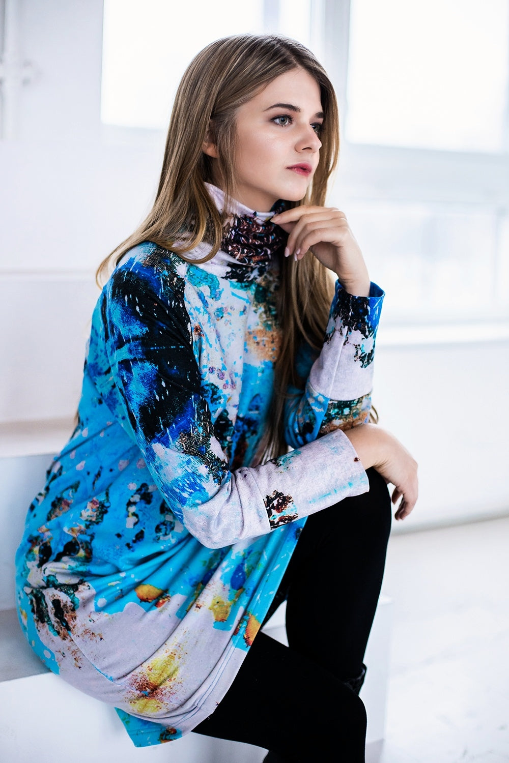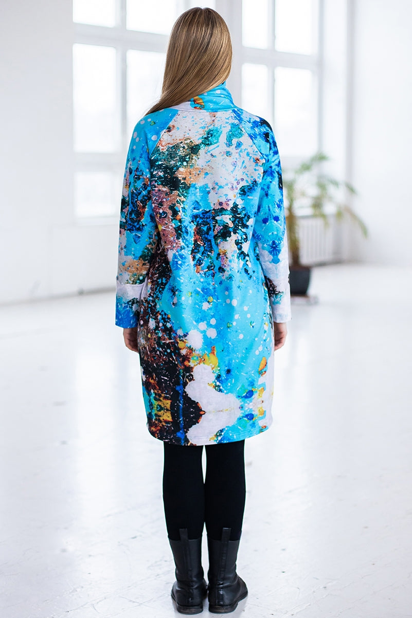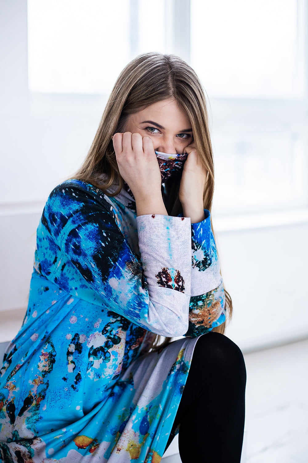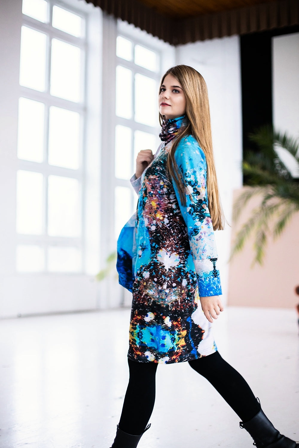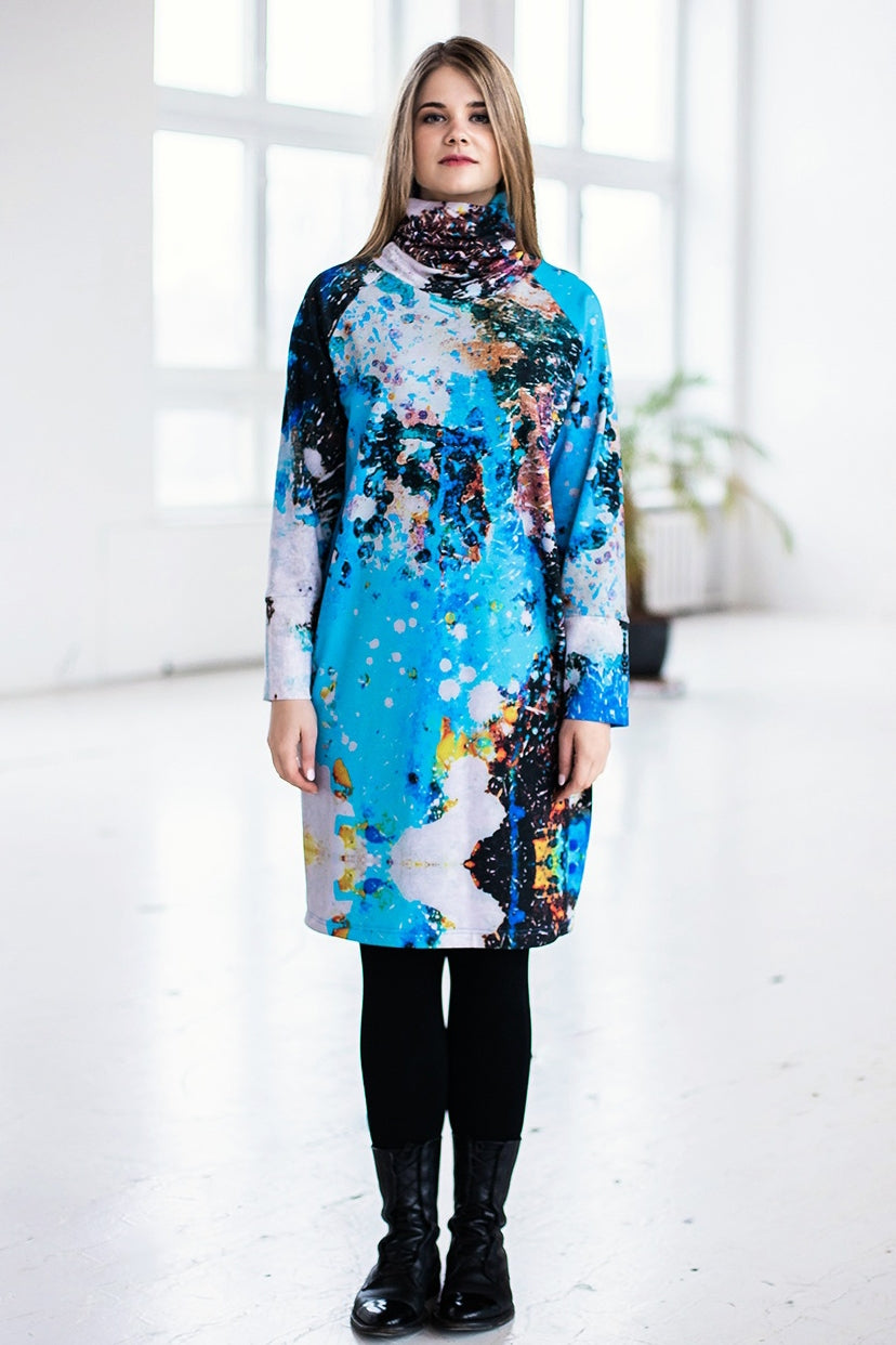 Kokvilnas džemperkleita ar augstu apkaklīti, ko vajadzības gadījumā var nēsāt virs mutes un deguna. Mūsu zili pelēks apdrukas dizains.