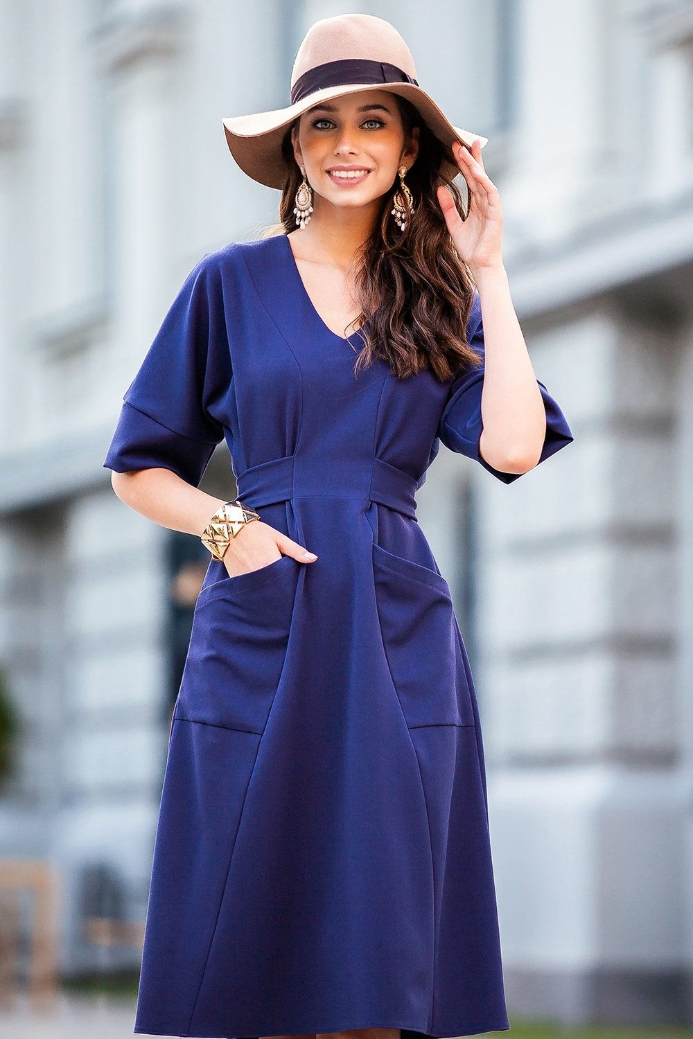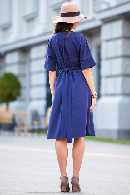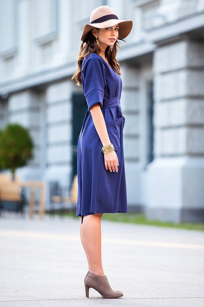 Midi tumši violeta kleita ar jostu un sānu kabatām. Kleita ar atsevišķu jostu mugurāpusē, v-veida kakla izgriezumu un īsām piedurknēm.