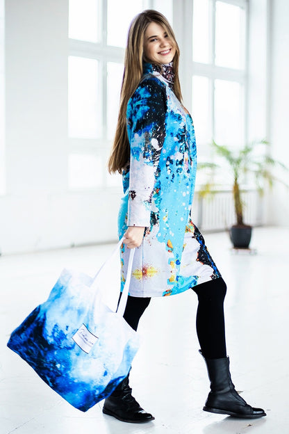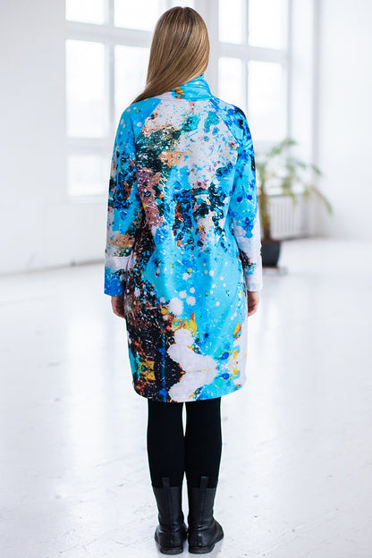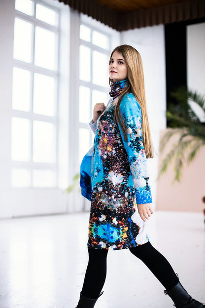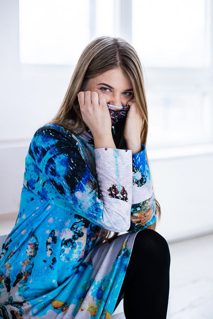 Cotton jumper dress with high neckline which can be worn over the mouth and nose if necessary. Our blue-gray print design.