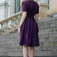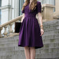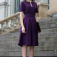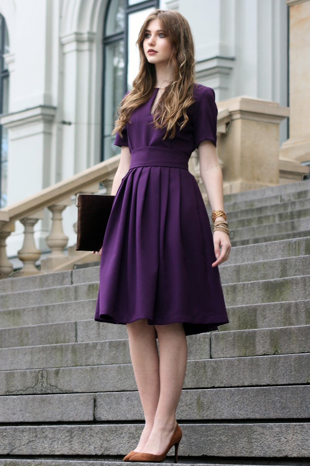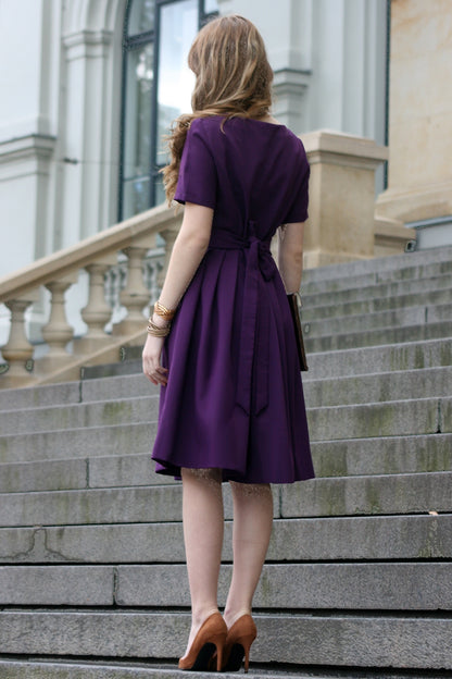 Full purple dress with pleats. Gold detail in neckline. Dress with mid sleeves and zipper on the side, tying belt at the back. The material isvery comfortable for wearing them, slightly elastic and crease.When washing, the color remains the same brightness.
