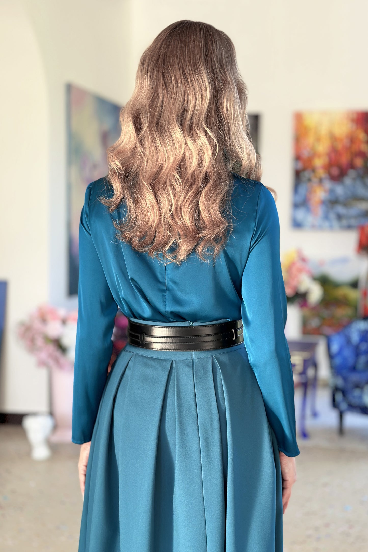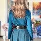 Peacock color blouse with pleats on shoulder and long sleeves.