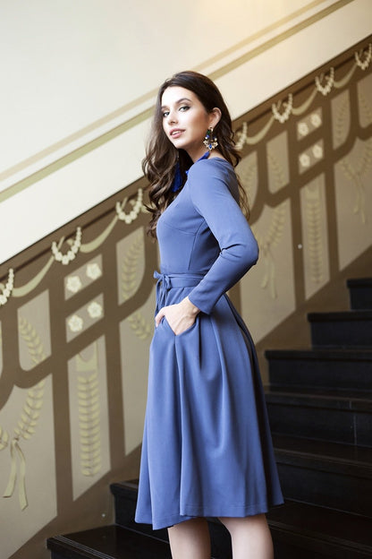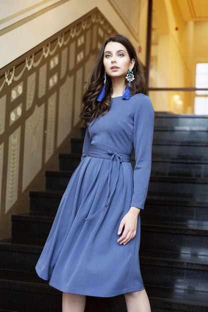 Blue dress with side pockets and rounded neckline. Dress with long sleeves, separated belt, pleats in skirt parts and zipper on the back.