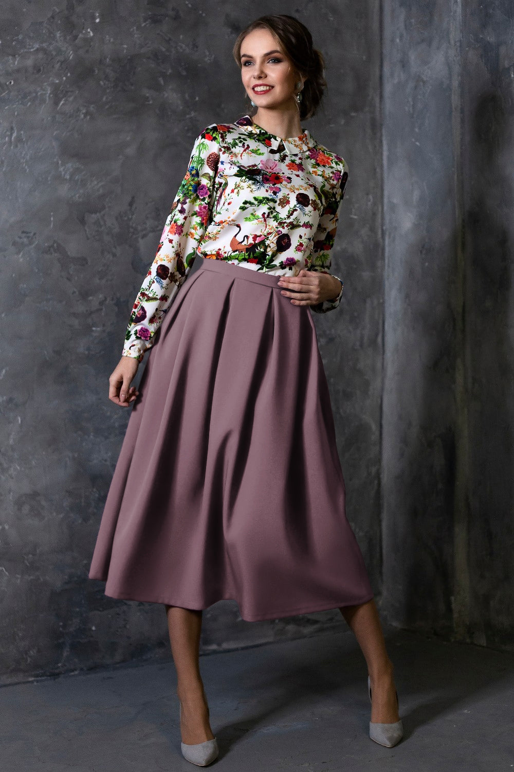 Grey purple full skirts with side pockets and lining. Material is comfortable to wear, slightly elastic, won’t crease. When washing, the color remains the same brght.