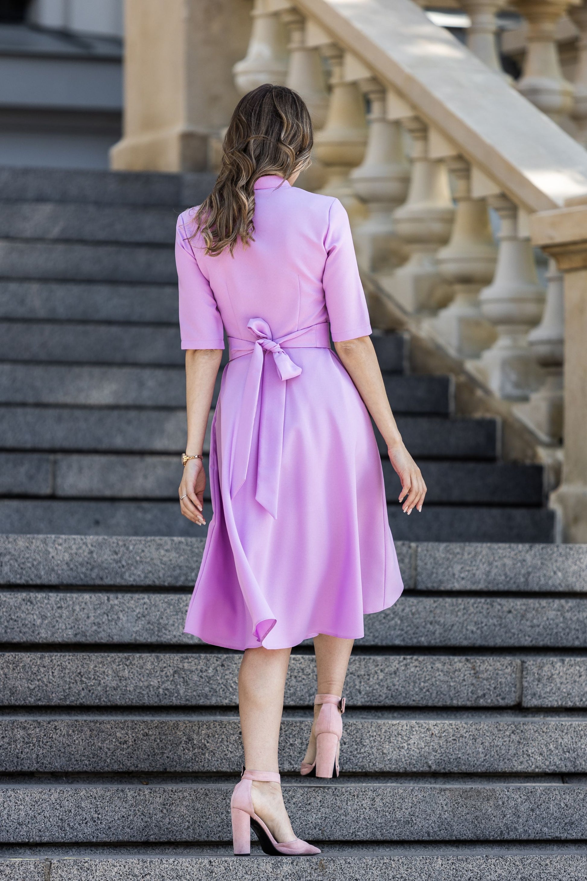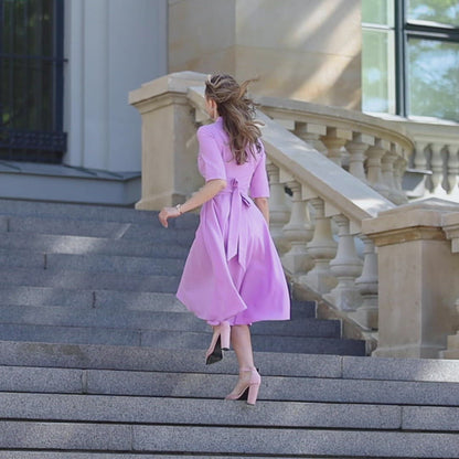 Half-length sleeves, v-neckline. Mid lining in skirt part. Material is very comfortable to wear, slightly elastic and won’t crease. When washing, the color remains the same brightness.