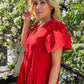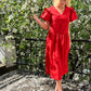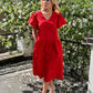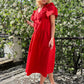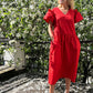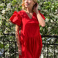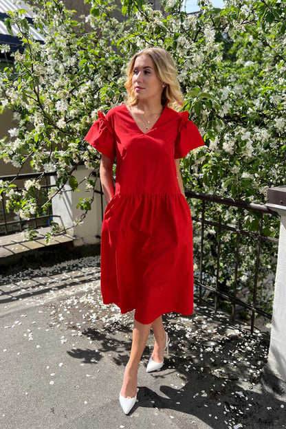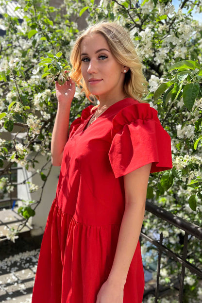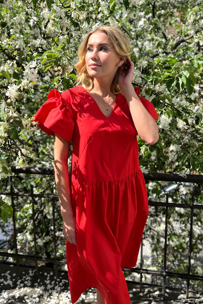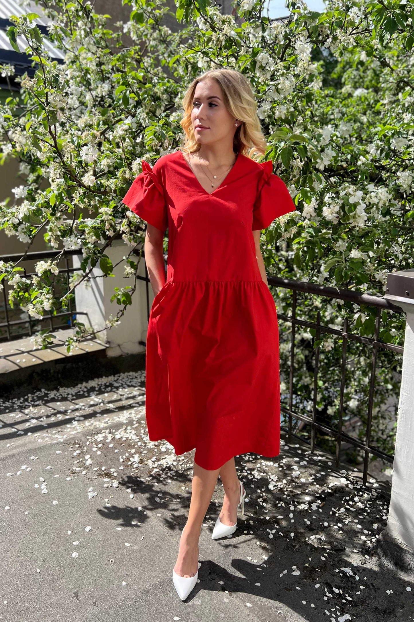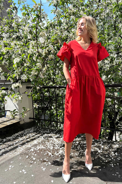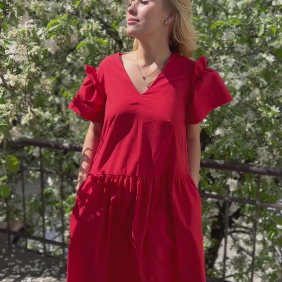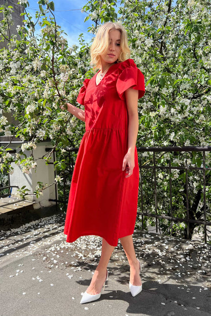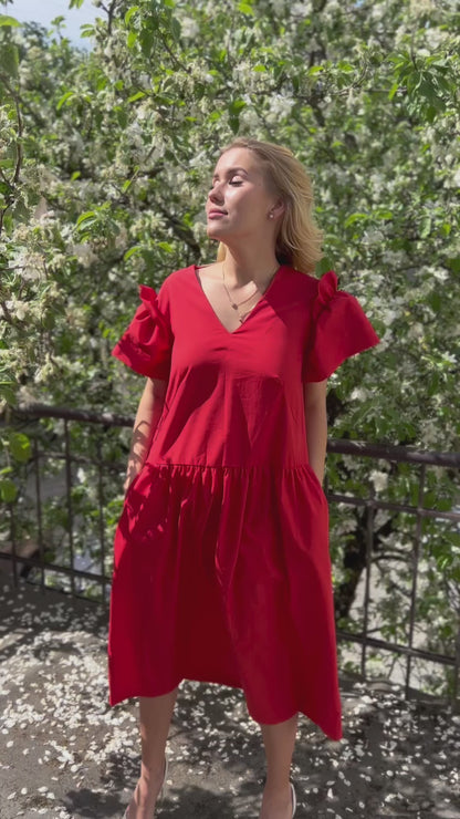 The red cotton dress combines stunning style and comfort. It is created in an oversize style, which gives it a contemporary and modern look. The dress has a V-neckline, a voluminous and airy frill sewn into the sleeves, which gives the dress a romantic image and will attract everyone's attention.